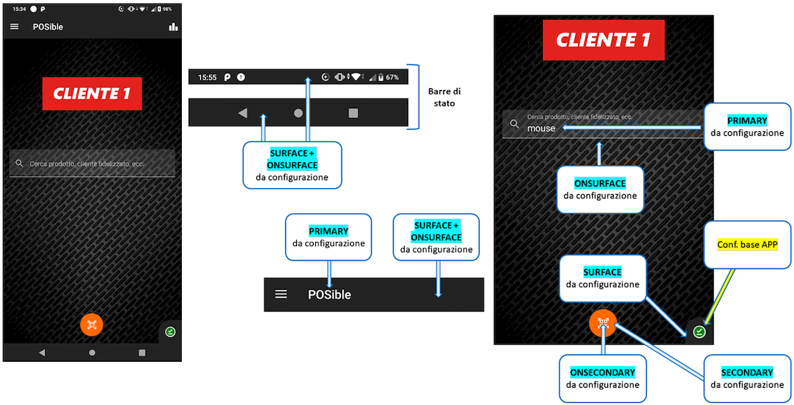 Di seguito vengono presentate, come esempio, alcune immagini delle pagine di POSible, configurate in modo da utilizzare la UI standard di POSible, la “UI di default”, con l'impostazione “LIGHT mode” oppure una UI personalizzata, la “Cliente1 UI” con l'impostazione “DARK mode”.