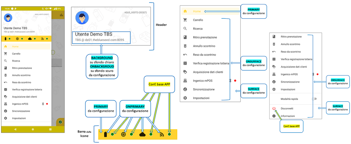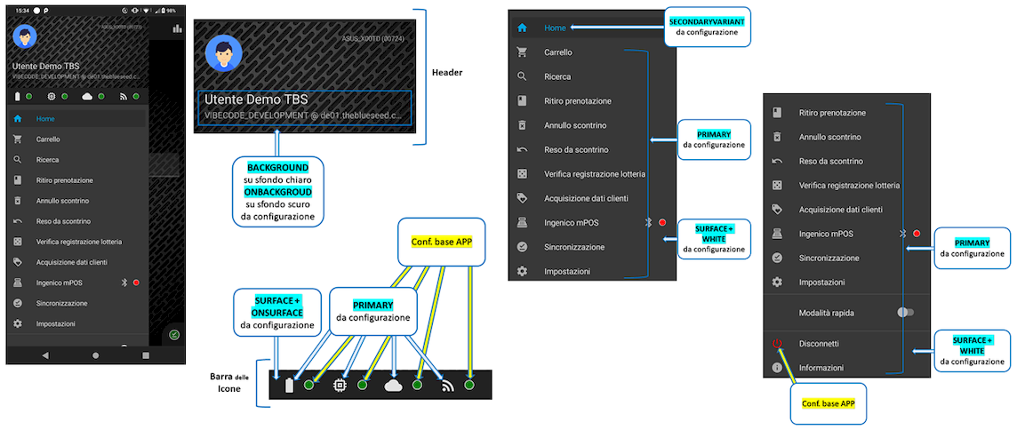 In questo menu il colore degli indicatori di stato a fianco alle icone “batteria”, “memoria”, “sincronizzazione tabelle”, “websocket” e dell’icona vicino alla voce «Disconnetti» è definito nel codice.