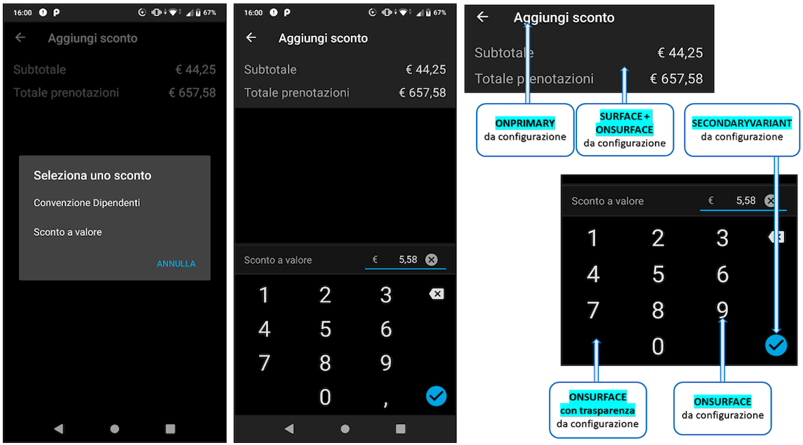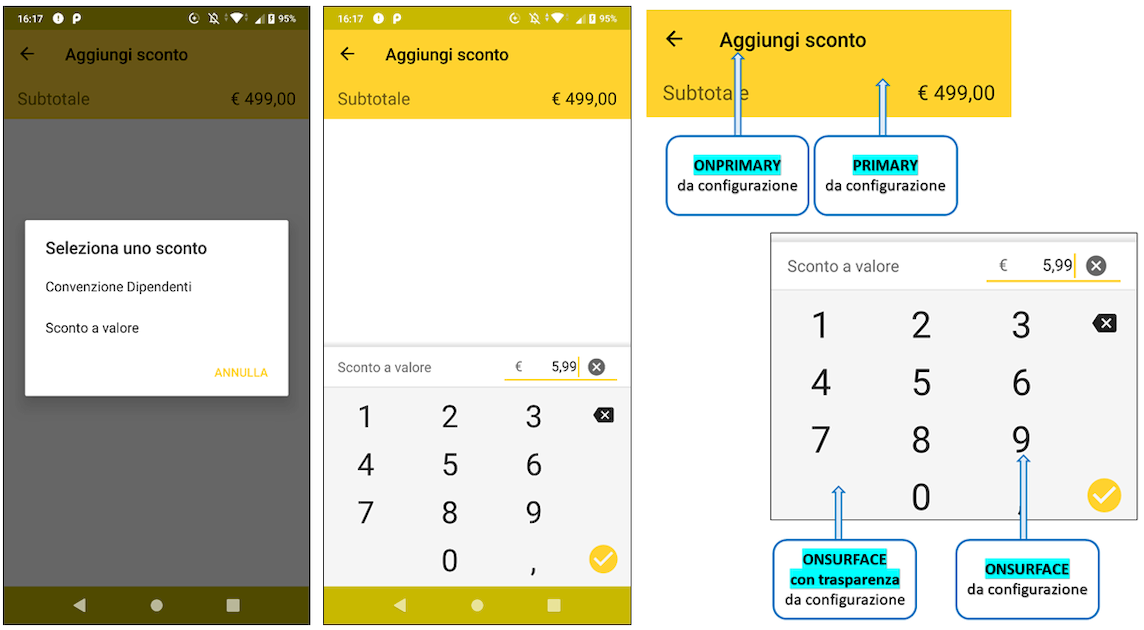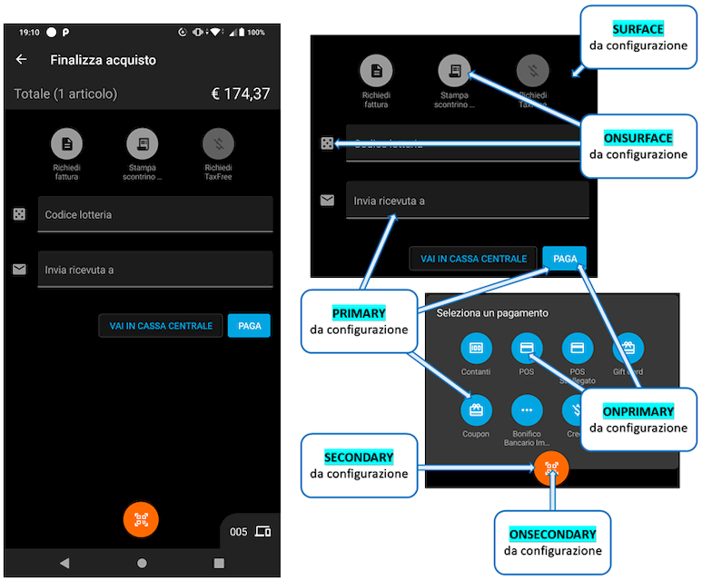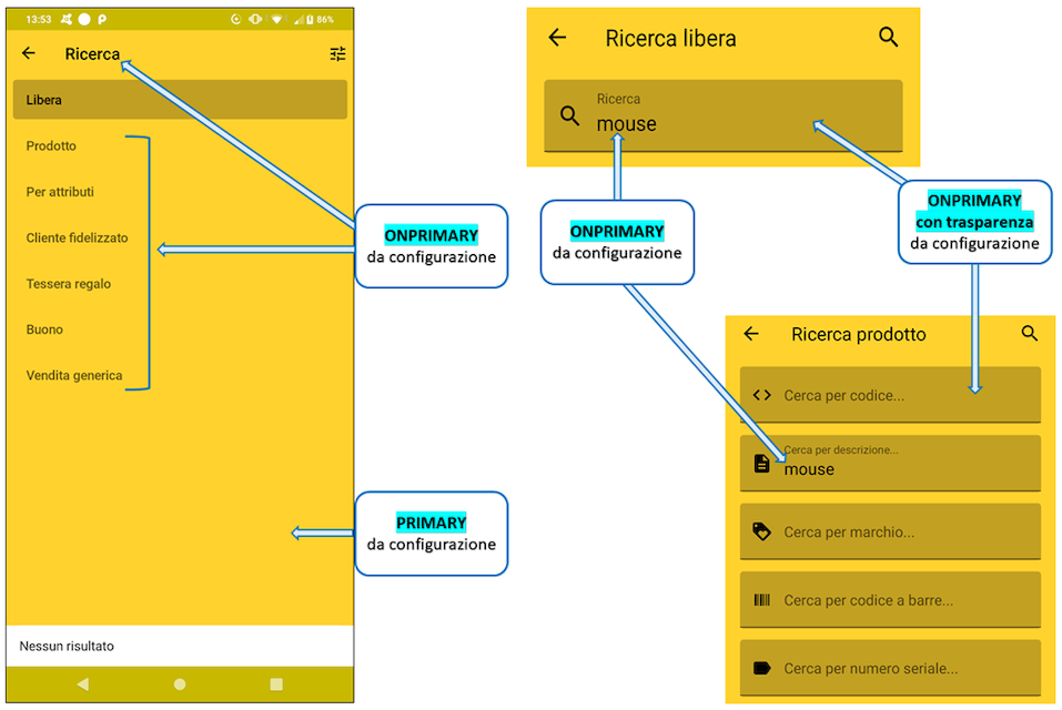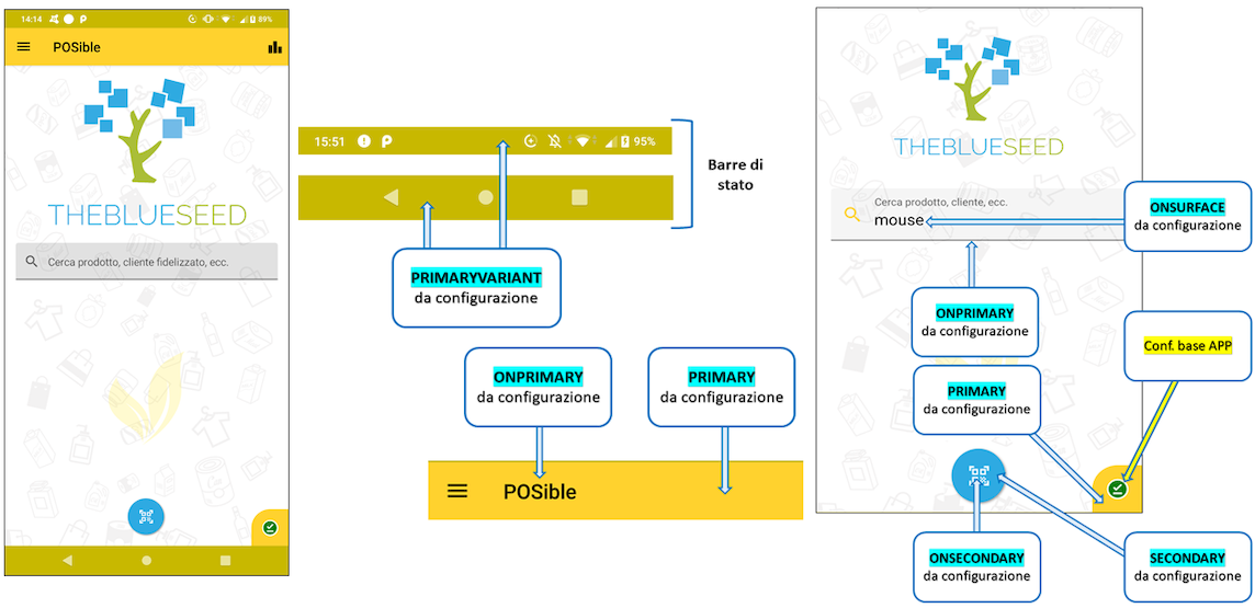 Nell’immagine qui sopra “Primary Color” viene utilizzato per colorare la barra del titolo della pagina, mentre “On Primary Color“ è utilizzato per il colore del font del titolo della pagina. Il colore delle barre di stato invece è configurato nel campo “Primary Color Variant”. Per lo sfondo del pulsante che attiva la scansione viene utilizzato il colore definito nel campo “Secondary Color” e “On Secondary Color” per il simbolo in primo piano.