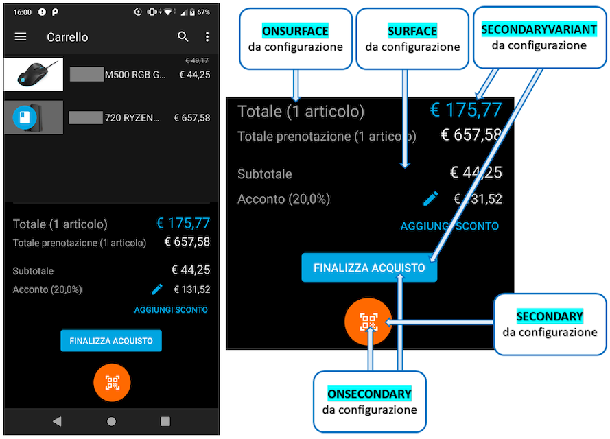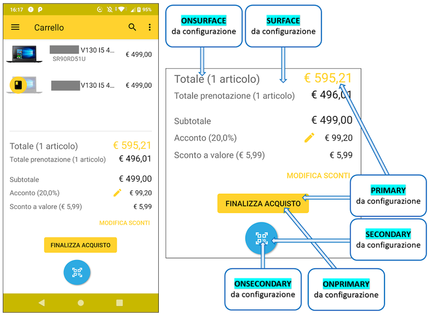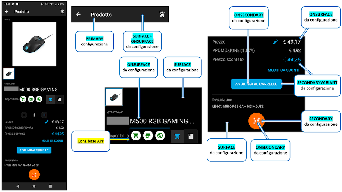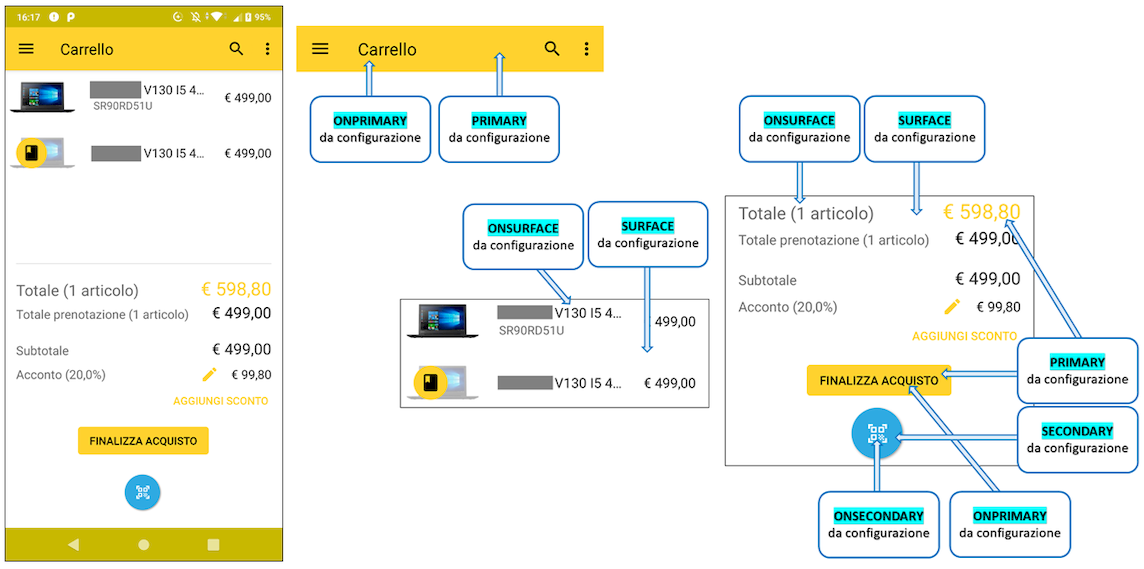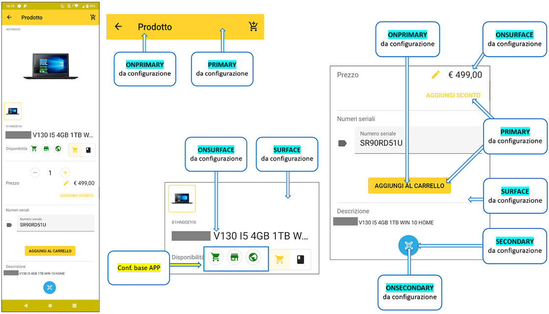 Nell’immagine qui sopra “Primary Color” viene utilizzato per colorare anche lo sfondo del pulsante “AGGIUNGI AL CARRELLO”, mentre per il colore del font viene utilizzato “On Primary Color“.