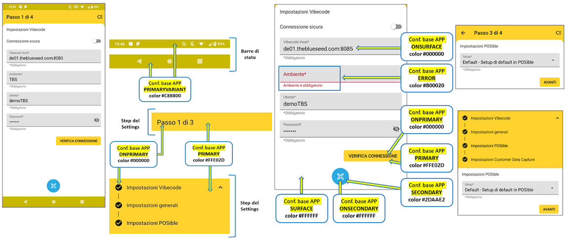 Elenco dei nomi dei campi della tabella «POS UI Setup», che contengono la definizione dei colori in esadecimale, e il loro corrispondente utilizzato nella APP: