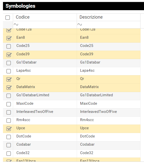 Questo parametro indica a POSible quale setup Scandit utilizzare per attivare la funzione di scansione da fotocamera/lettore laser su smartphone e palmari. Se il parametro non è valorizzato POSible utilizza una funzionalità inserita di default nel proprio codice. Scandit è il software che consente di leggere barcode e qrcode. Il setup di Scandit è salvato nella tabella Scandit Setup (kScanditSetup), attenzione a quali tipologie sono selezionate nel setup: