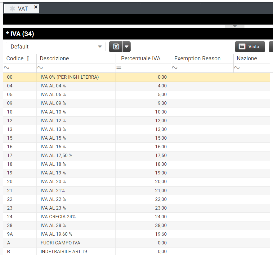 ➡️ Definire la lista dei codici IVA nella tabella kVATCode. Esempio:
