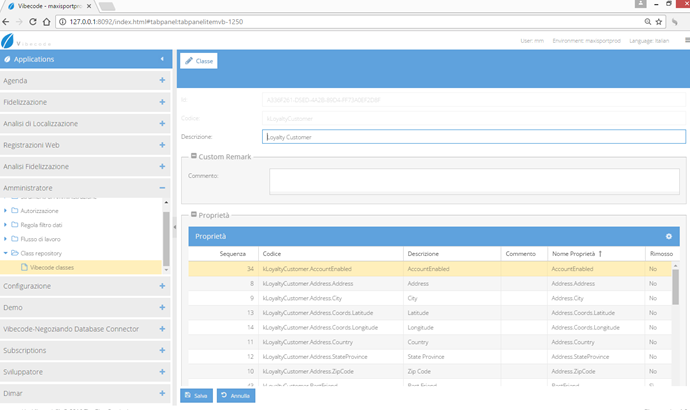 Tramite il menu di Vibecode è possibile consultare il repository di tutte le classi (tabelle) e relative proprietà (campi) che potranno poi essere utilizzate nei filtri.