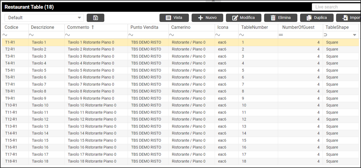 tabella kFBRestaurantTable, elenca i tavoli del ristorante