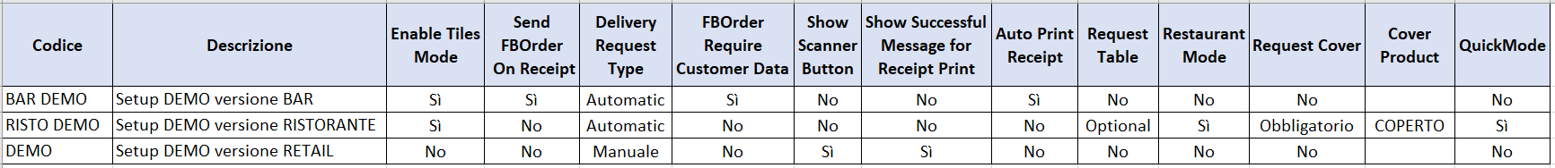 Restaurant Mode deve essere impostato a “Sì” se si desidera attivare la gestione di sale e tavoli, e Request Table deve essere diverso da “No”