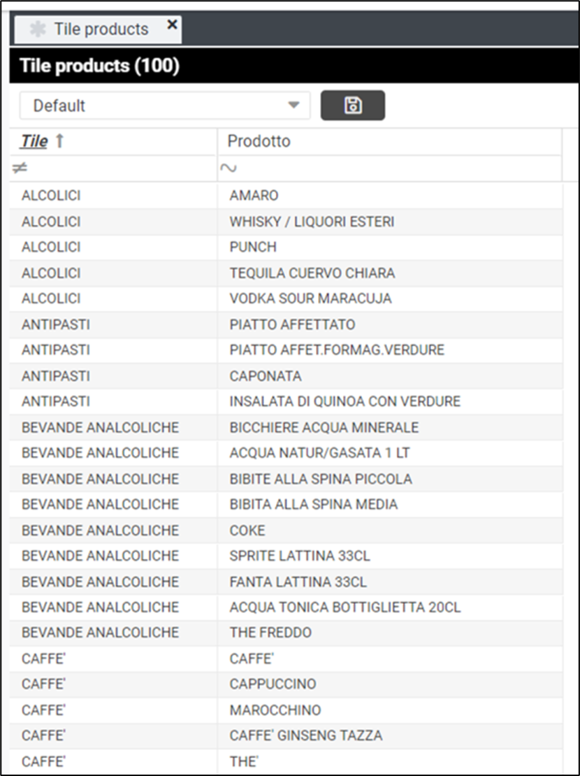 I tile di livello più basso, come ad es. “ANTIPASTI”, contengono i prodotti o i piatti che l’utente imposta creando una lista oppure un filtro.