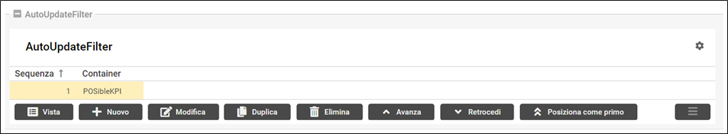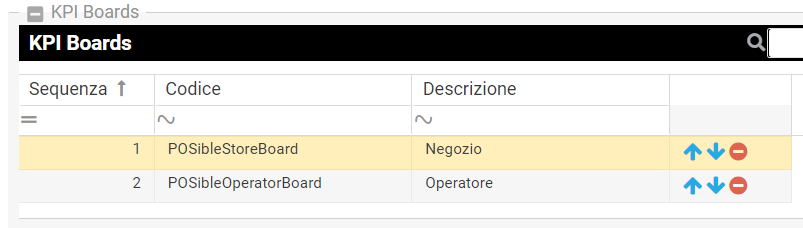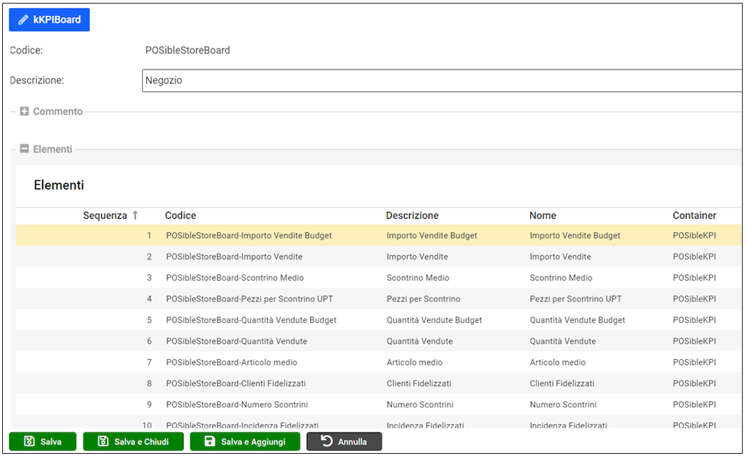 Il ContainerGrid “Elementi” visualizza e permette di gestire i record della tabella kKPIBoard_Items.