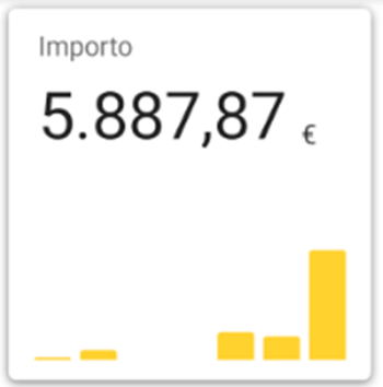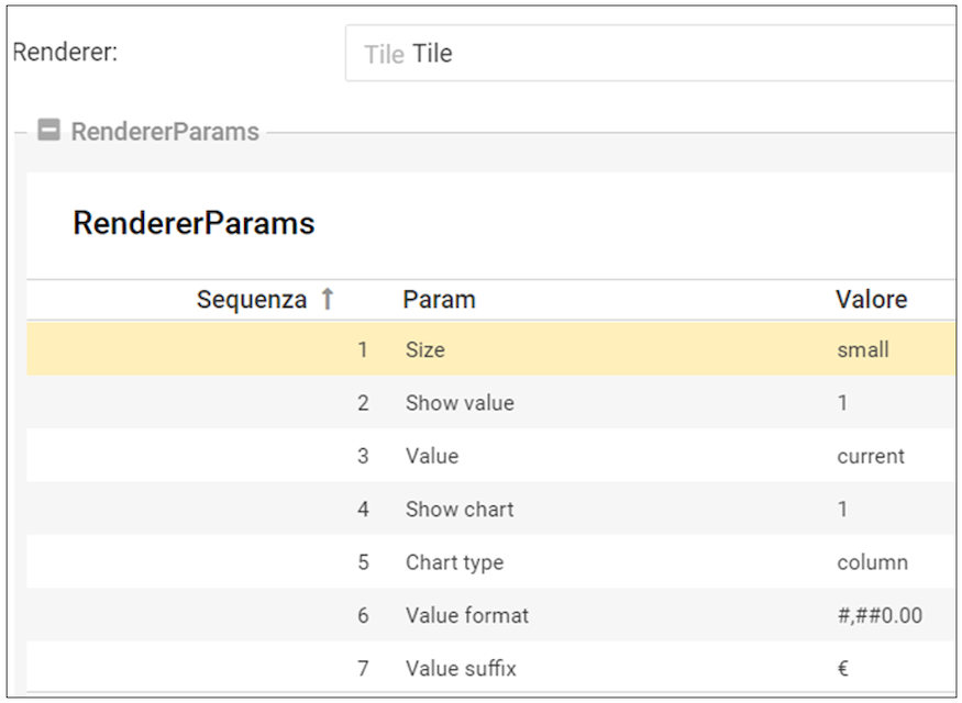 In questo caso si vuole ottenere un pannello piccolo (Size = “small”) con un grafico (Show chart = 1) che mostri il valore corrente (Show value = 1; Value = current) sottoforma di istogramma (Chart type = Column), il valore esposto sarà formattato come indicato con il parametro Value format e avrà come suffisso il simbolo dell’euro (Value suffix = €).