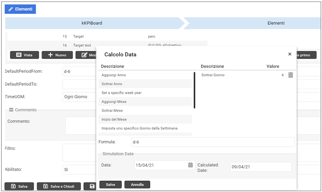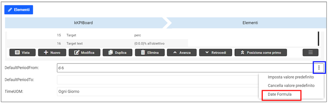 Per impostare correttamente questi parametri si può utilizzare il tool “Date Formula” presente nel menu dei campi DefaultPeriodFrom/DefaultPeriodTo che si attiva cliccando sui tre puntini verticali: