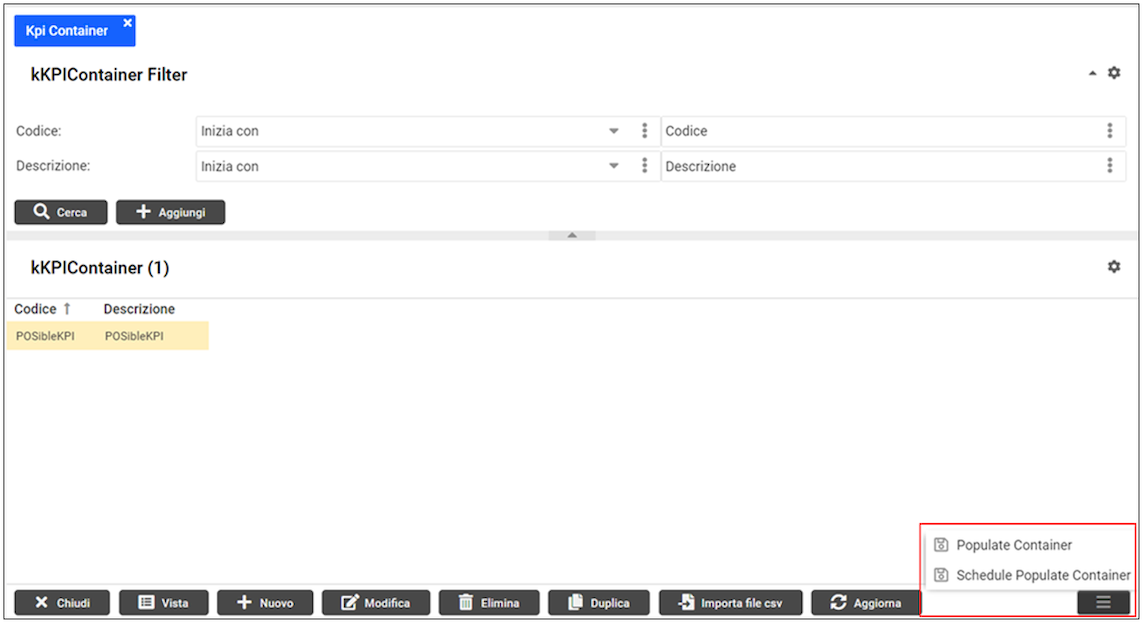 Il popolamento dei dati del container, definito nella tabella kKPIContainer , può essere eseguito dall’utente in real time utilizzando il comando “Populate Container” presente tra i pulsanti in fondo alla pagina.