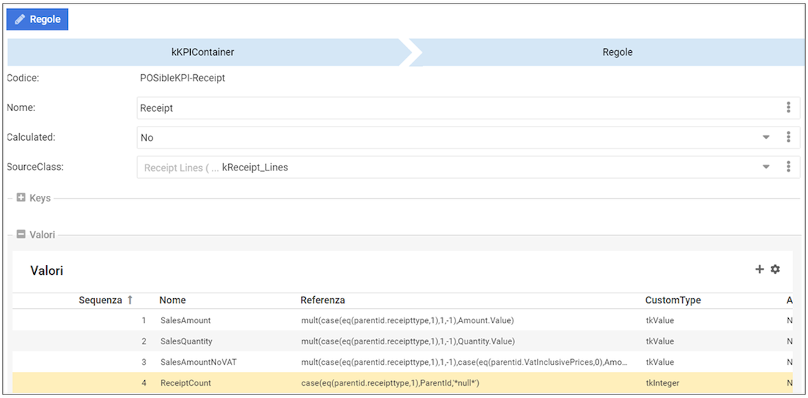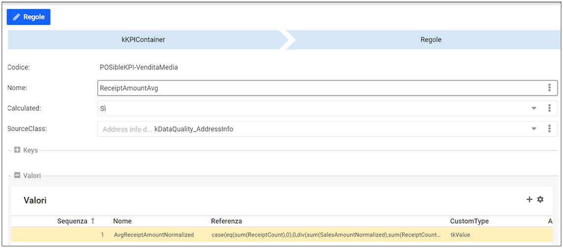 ReceiptCount e SalesAmountNormalized sono due KPI calcolati in altre regole del container e sono presenti in tabella kKPIContainer_Rules_Value.