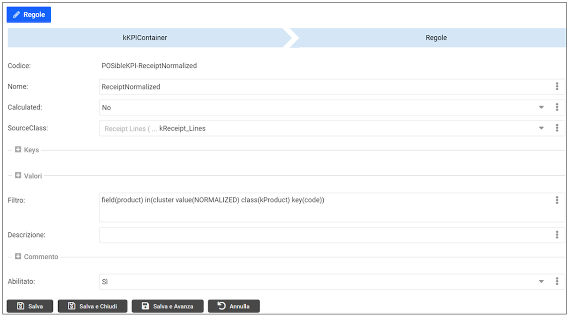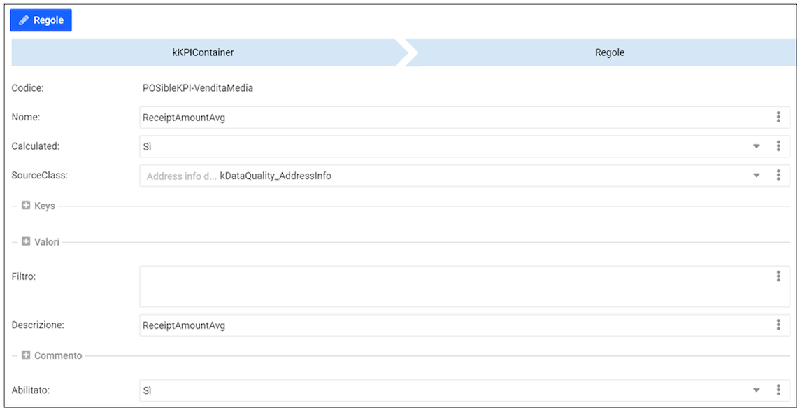 All’interno della tabella kKPIContainer_Rules sono presenti altri due ContainerGrid (“Keys” e “Valori”) che permettono all’utente di definire le chiavi delle regole e le formule di calcolo dei valori.