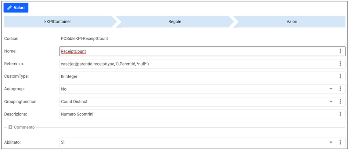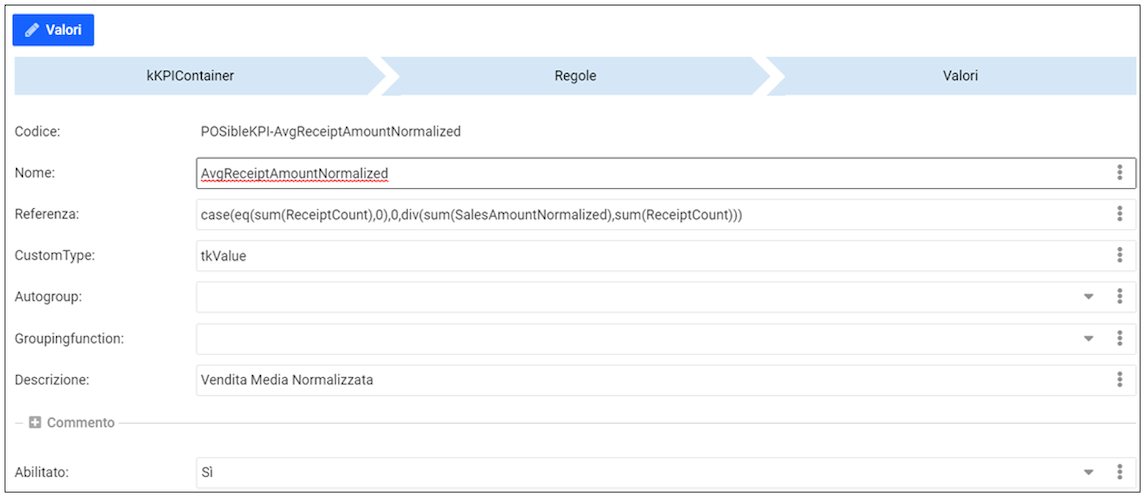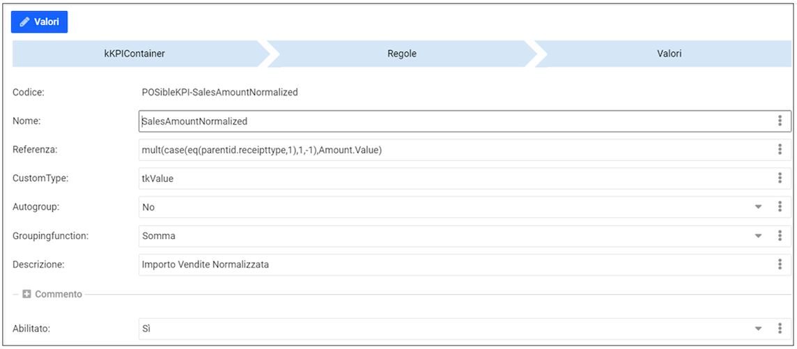 Il ContainerGrid “Valori” visualizza e permette di gestire i record della tabella kKPIContainer_Rules_Value.