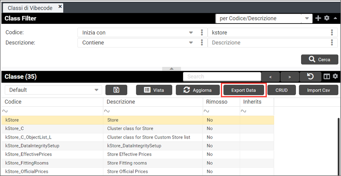 inserire il nome della tabella da cui scaricare i dati, fare una ricerca e selezionare la riga interessata. Per accedere alla sezione per la creazione del file di export è necessario cliccare sul bottone [Export Data].
