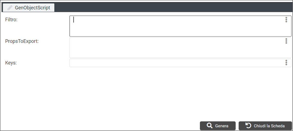 Nella sezione GenObjectScript l’utente può inserire un filtro (vedi doc: Filtri ) per selezionare/limitare il numero di record della tabella da esportare nel file oppure può elencare i campi della tabella che vuole esportare, valorizzando il campo PropsToExport; cliccando sul bottone Genera viene creato il file di script con i dati esportati.