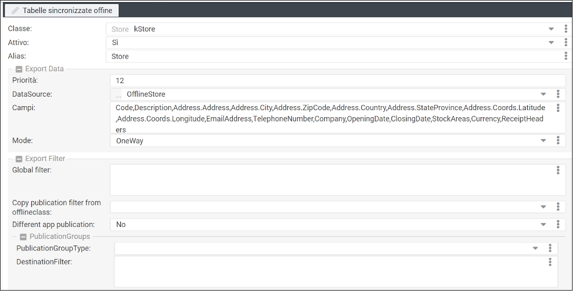 Il campo Keys invece viene utilizzato, ad esempio, per l’export della tabella kOfflineClasses, inserendo il valore “Alias”, per eliminare il campo ID dai record esportati.