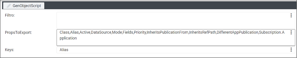 PropsToExport - inserendo i seguenti valori Class,Alias,Active,DataSource,Mode,Fields,Priority,InheritsPublicationFrom,InheritsRefPath,DifferentAppPublication,Subscription.Application