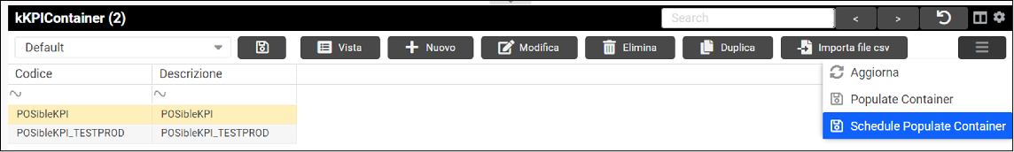 Popola la tabella kKPIContainer. Schedulazione: eseguire una volta al giorno, ogni giorno. L’utente può lanciare manualmente il servizio da Vibecode, cliccando sul comando “Populate Container” dopo aver selezionato il container KPI da aggiornare da: Amministratore > Configurazione > KPI > KPI Container oppure può impostare la schedulazione utilizzando il comando “Schedule Populate Container”.