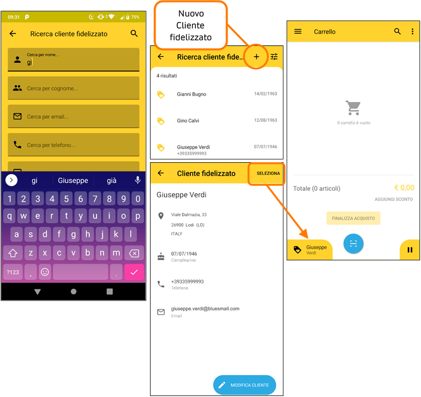 Questa pagina di ricerca consente di trovare un Cliente fidelizzato e di assegnarlo al CARRELLO.