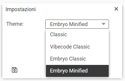 Con un click sulla prima icona in alto a destra nella main page di Vibecode, l’utente ha la possibilità di accedere ad un menu per visualizzare il proprio profilo, cambiare il tema, cioè la veste grafica di Vibecode, oppure segnalare un bug.