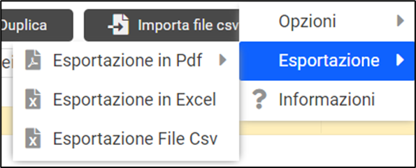 I dati visualizzati nelle griglie possono essere esportati in formato PDF, Excel o CSV accedendo alla voce di menu Esportazione, cliccando sull’icona a forma di ingranaggio ⚙️ :
