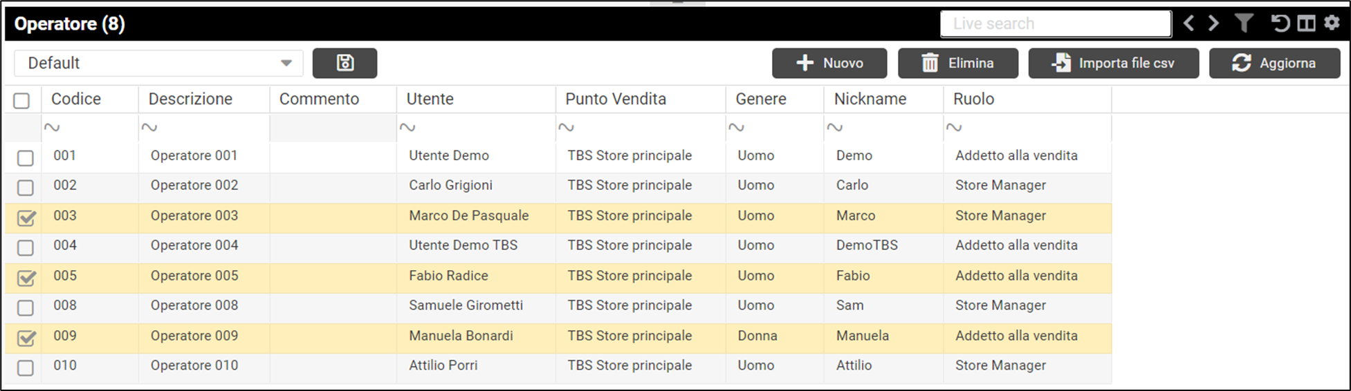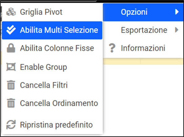 Alcune operazioni possono essere effettuate contemporaneamente su più record attivando la multi selezione dalla voce di menu Opzioni, cliccando sull’icona a forma di ingranaggio ⚙️ :