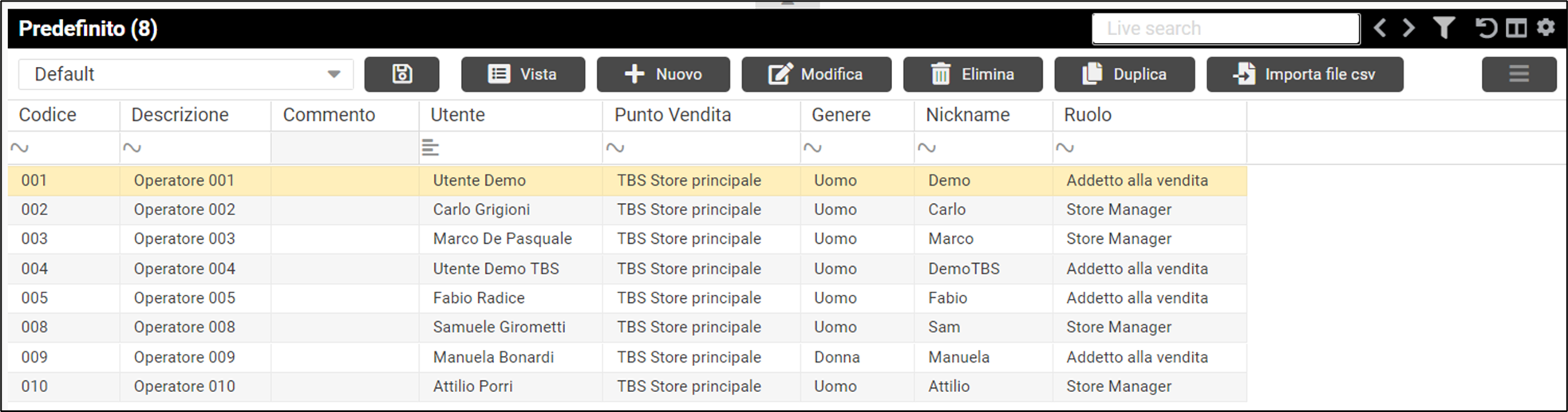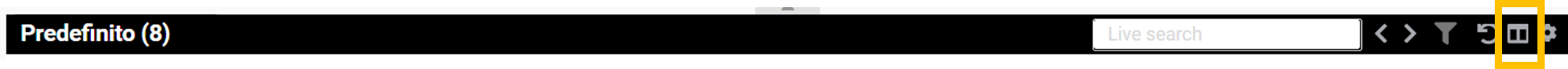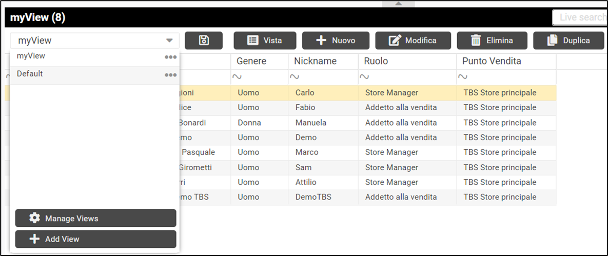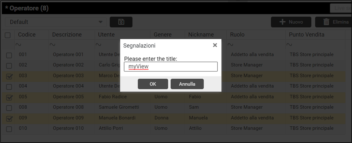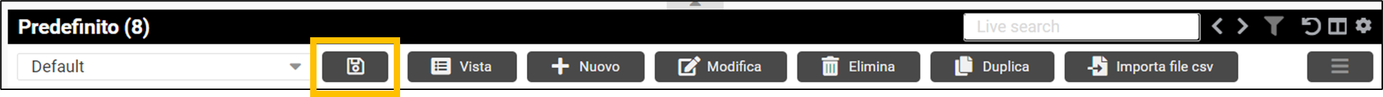 Tutte le personalizzazioni effettuate sul layout della griglia possono essere salvate con un click sul bottone con l’icona dischetto 💾. Verrà richiesto di inserire un nome per identificare la nuova configurazione della griglia. La lista delle viste create, più quella di default, è visibile nella casella a discesa di fianco all’icona dischetto: