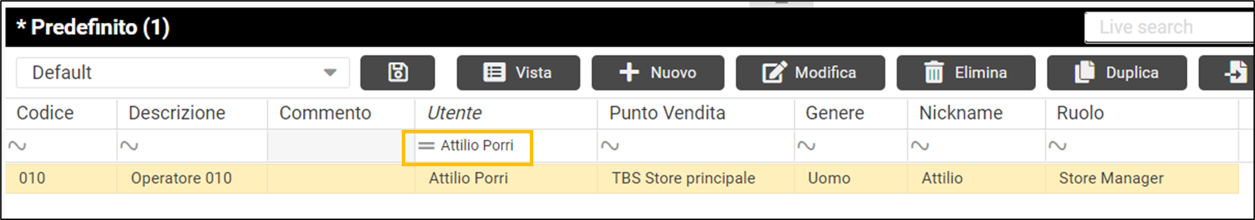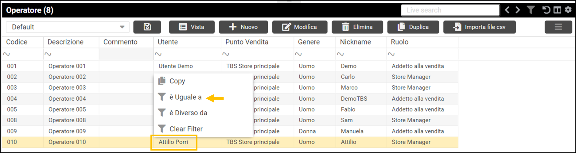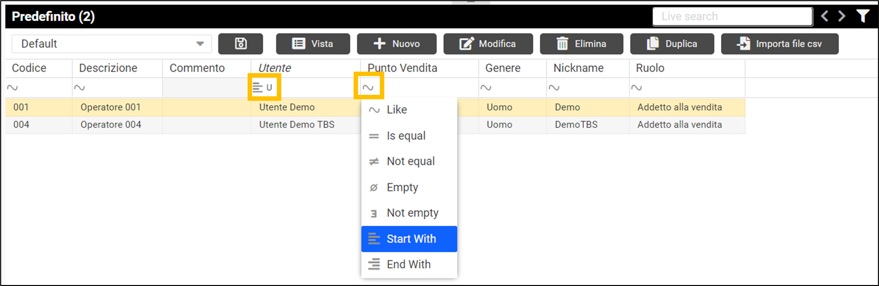 L’utente può inoltre utilizzare gli operatori di confronto direttamente sui valori contenuti nelle colonne della griglia, per filtrarne il contenuto: