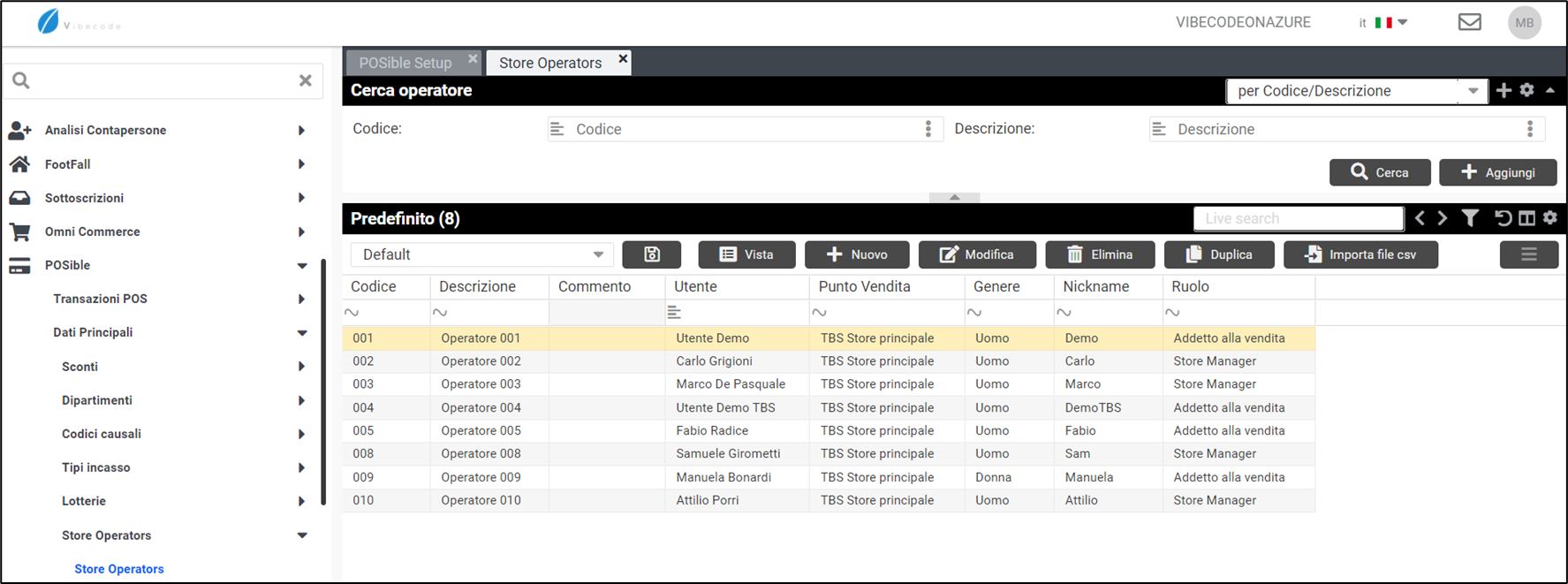Facendo click su una voce del menù è possibile visualizzare la tabella o la vista corrispondente.