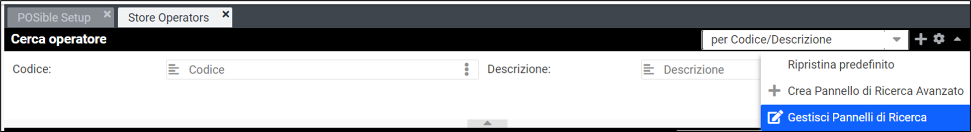 Con un click sull’icona a forma di ingranaggio (in alto a destra vicino alla casella a discesa con il nome del search panel attivo) compare il menu con le voci per gestire i Pannelli di Ricerca.