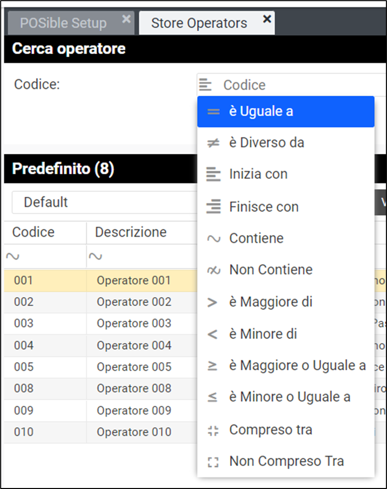 Ultima Nota: i campi di ricerca nel search panel contengono una lista di operatori di confronto per la selezione dei dati. Selezionare quello più appropriato per la ricerca che si vuole intraprendere.