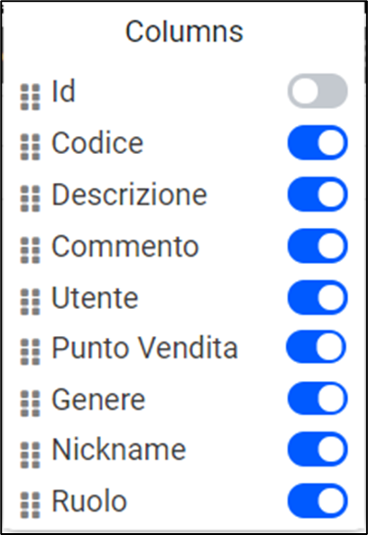 Per nascondere e/o spostare le colonne è possibile anche utilizzare il menu Columns che si visualizza cliccando sull’icona a forma di colonne nella parte destra dell’intestazione della griglia principale: