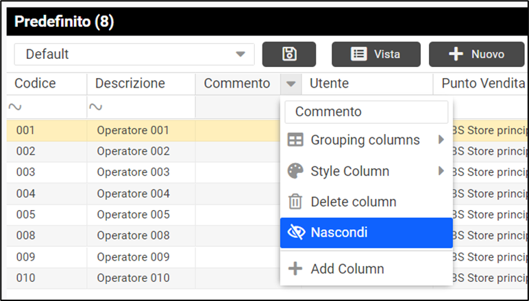 nascondere una o più colonne, cliccando su “Nascondi” nel menù dell’intestazione della colonna (questo menu si visualizza con un click sulla freccia, nell’intestazione della colonna, che compare al passaggio del mouse);